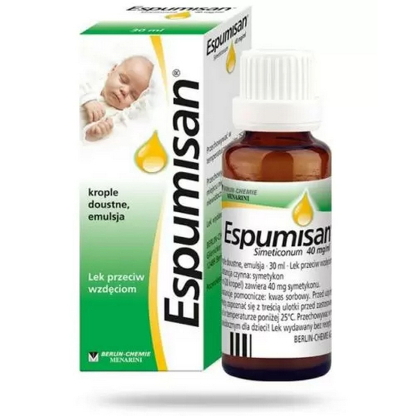 Espumisan krople to lek zawierający symetykon, przeznaczony dla niemowląt od 1. miesiąca życia, dzieci i dorosłych. Preparat skutecznie redukuje nadmiar gazów w przewodzie pokarmowym, łagodząc wzdęcia, uczucie pełności oraz kolkę niemowlęcą.